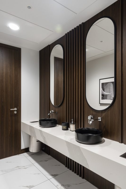 Among them are partitions with flowerpots, wall and ceiling decorations. Dynamic directions in the interiors, multi-level installations, elegant carpentry of glass walls, ceiling luminaires as well the walls ones or the wide range of carpeting and much more are unique elements of the design.