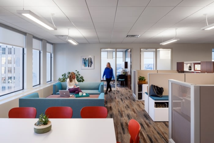 Capturing prominent views of the Virginia Capitol, the prime gathering place – the café – was positioned at the windowed corner of the office. By locating the large 26-person conference room adjacent to the café, the layout offers the opportunity to open up from end to end, in order to support larger functions. The addition of a glass folding wall bisecting the two spaces also allows the spaces to be used independently for smaller functions and day-to-day use.