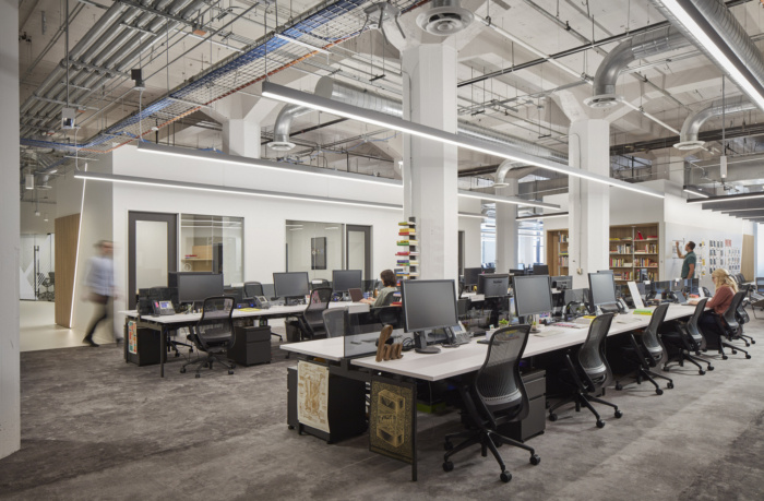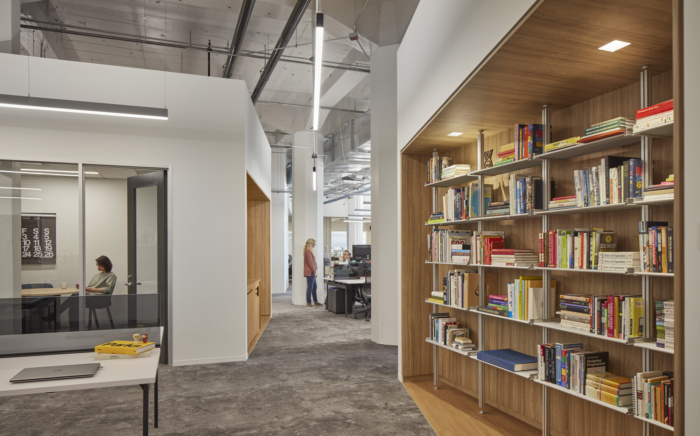 The result is a space that relies on the inherent charms of the building‘s historic architecture, while representing the agency‘s brand in subtle ways. In addition to carving out angular millwork slats on in the lobby and collaboration areas, the floor plan itself is at a slant, which evokes the agency‘s lettering. Thanks to this design concept, the office feels engaging and bright, despite having windows on only one wall.