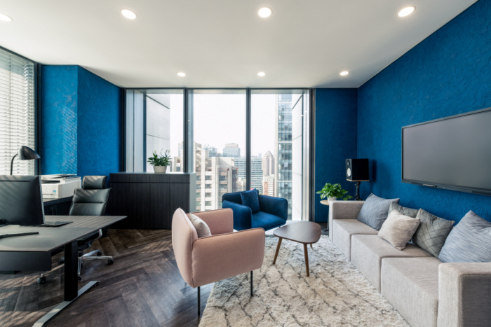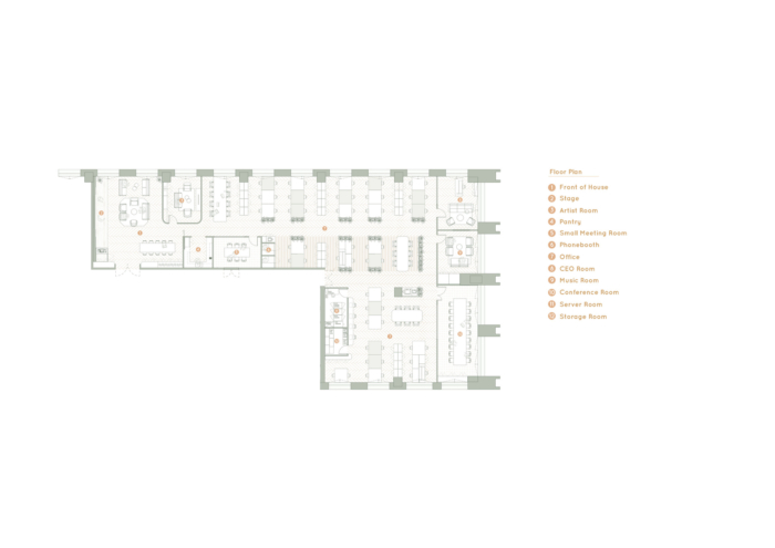 This project embraces a woven material palette that incorporates various use of materials such as timber, brushed copper highlights, and herringbone-patterned timber vinyl, which are drawn from the textures of traditional Chinese instruments. Acoustic concerns play a big role in the project. The predominant use of wood and exotic choices of materials bring the office warmth and life, while the use of concrete and green vinyl flooring define the areas in the office.