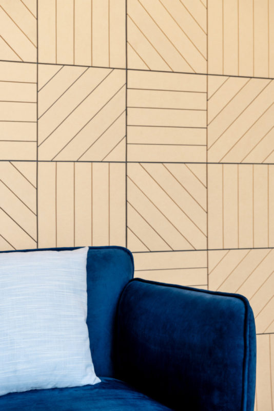 The open plan work neighbourhood is conceptualised as a ‘courtyard’, enclosed by supporting amenities in its backdrop and the building’s glass facade with city views and natural daylight. We wanted to create an intuitive and sociable workplace for music-related activities. We put together a colourful and elegant materials palette that feels dynamic but mature and elite. The idea was to create a sense of neighbourhood as a ‘courtyard’, enclosed by large windows out to the city views with supporting functions in a warm timber backdrop.
