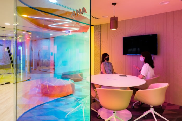 A strong sense of arrival has been created where users and visitors are visually oriented to intuitively navigate through various zones from this main junction space. Curved glass-wrapped meeting rooms conveniently situated at the reception area provide opportunities for casual touchdown discussions for employees or private conversations with clients and partners. ‘Colour-changing’ dichroic film has been used on the exterior of the meeting rooms to create a vibrant iridescent glow when viewed from different angles.