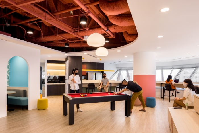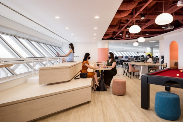 The central breakout area forms the heart of the space where employees can congregate, creating a convivial atmosphere. The elevated platform at its perimeter provides expansive views of the city skyline while doubling up as a functional storage space. Various seating options such as bar tables, benches and semi-enclosed booths offer alternative ways for employees to work, unwind and collaborate. The space can also be reconfigured to support high-density meetings such as company-wide events and townhalls.