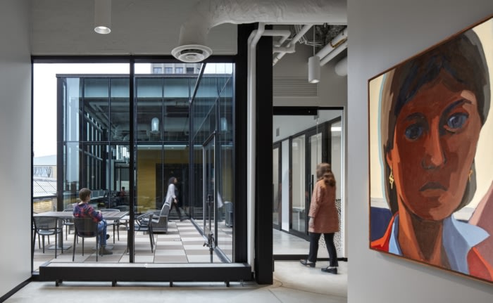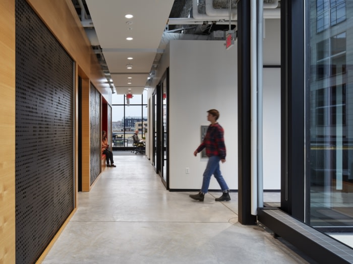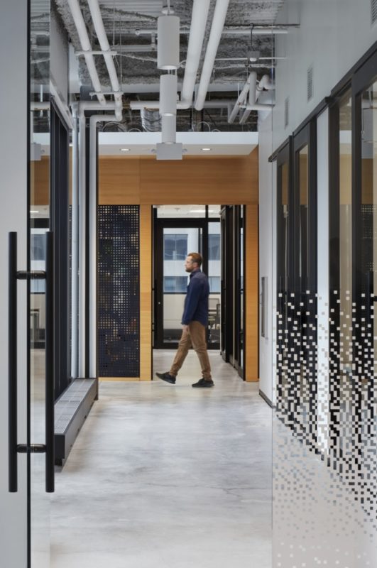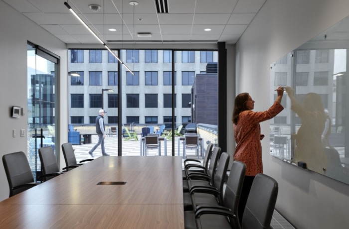 Demountable wall systems throughout allow for easy reconfiguration as the needs of members change over time. A mix of diverse work settings including open work, team rooms, and indoor/outdoor conference spaces allow members to work in the spaces that best fit their needs.