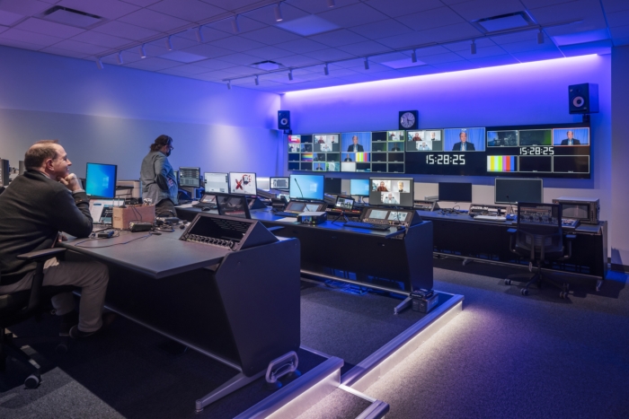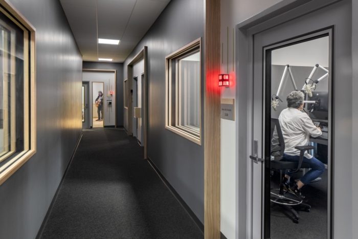 Controlling sound isolation, room acoustics, and noise and vibration control were essential to the success of the television and radio broadcast facility. Critical spaces were designed to have “room-within-a-room” construction, where the floor, walls, and ceiling are isolated from the surrounding building construction. Each area has a secondary floating concrete slab supported by the structural slab and interior walls are independent of the exterior and adjoining rooms, isolating them from the structure above and below. Sound isolation ceilings complete the isolated enclosures.