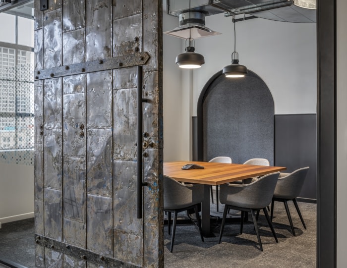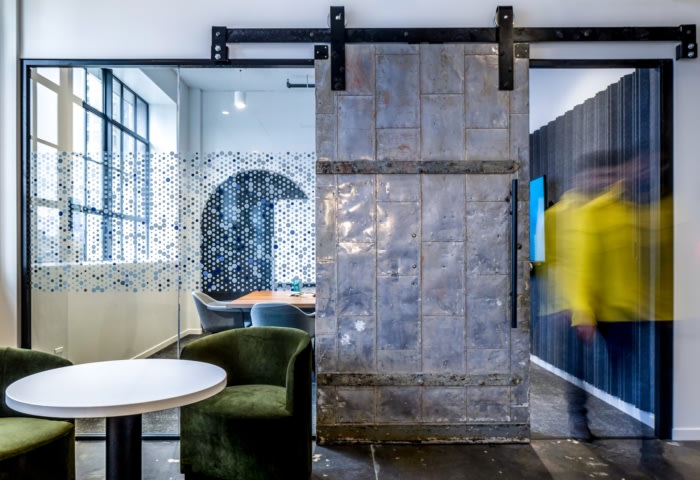 In urbanistic, architectural terms, this is not a cookie-cutter office for WPP; it is a crafted, thoughtful renovation of a building that represents Detroit’s urban history. Replacing most of a 1979 renovation, most of the interior was removed and rebuilt. All of the building systems are new: HVAC, lighting, graphics. The gist of the architectural interventions was not to include anything that was non-essential. Accordingly, much of what has been exposed in the original structure is visible: brick walls, columns, window frames, staircases. bracings, cast iron fire stair, windows, mosaics and concrete floors were left in place; sliding barn doors are from the original building as well, giving the interior a sense of place and authenticity.