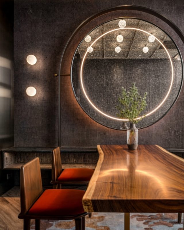 The designer pays attention to form follows function for the Cigar room — the hanging shelves, for example, are more than just a dramatic design element, they maximize the use of space and create the illusion of height. The two wine cellars, chairs, tables, and soft matching carpets were hand-selected and thoughtfully thematically considered, giving the space so much soul.