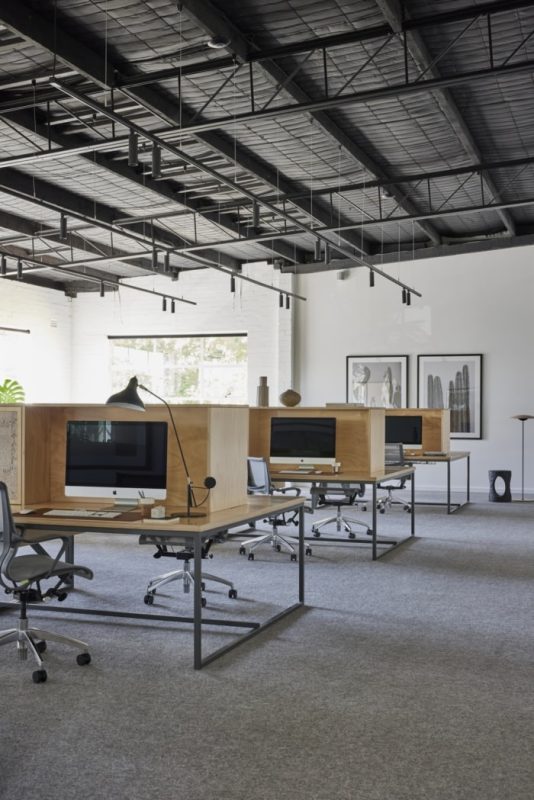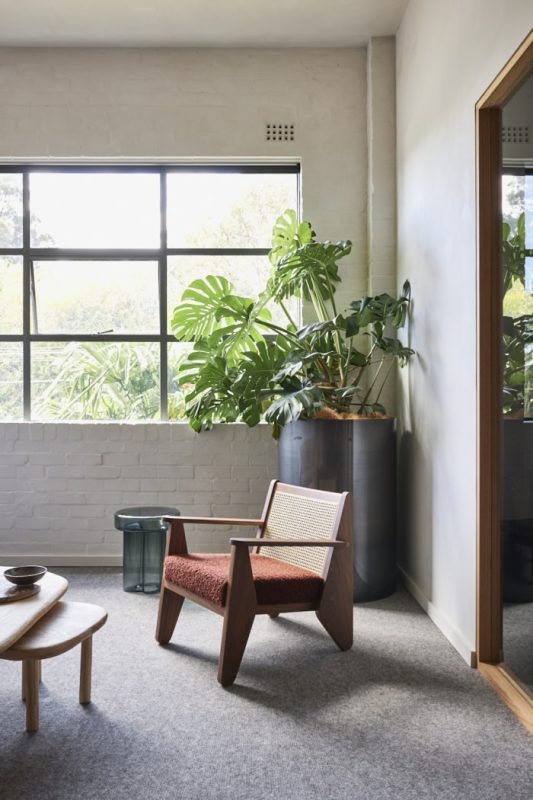 Sandblasted limestone pavers flow effortlessly from exterior to interior, where a conservatory-style gallery welcomes visitors and presents a canvas for client presentations, industry events, talks and workshops. A series of bespoke, honey-coloured plywood cabinets articulate project material displays, fostering a constant connection to Wyer & Co’s design process, while a large Phoenic roebelenii mirrors the tone of the exterior planting, its fronds reaching towards the skylight above.