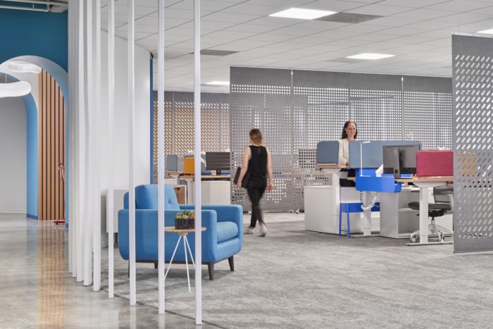A variety of work environments offers teams abundant choices: open collaboration spaces, private or shared offices, conference and phone rooms, and neighborhoods with workstations that can rotate for different configurations. Dividing the work and casual break areas, ceiling-hung perforated-felt screens with playful patterns abet acoustics and visual privacy to reduce distraction. Custom bike racks cap the end of each workstation cluster, instating separation from the circulation path while doubling as an art feature.