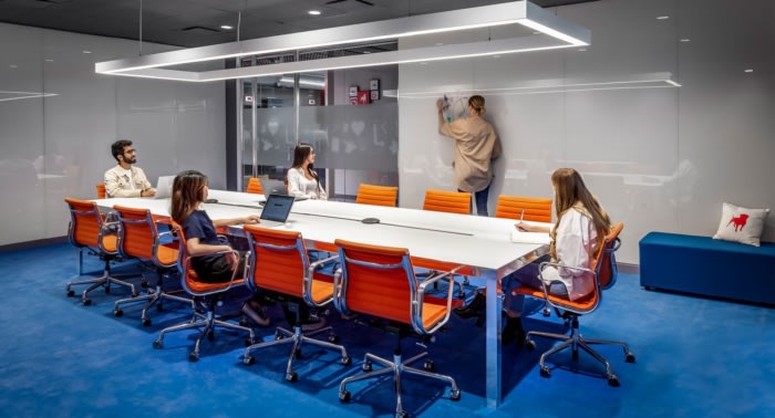 This multi-floor space has a communal booth wall featuring worksurface space beneath beautiful colour-blocked archways. A reception area communicates Zynga’s playful branding and the Toronto skyline, while bold, positive colour schemes coupled with accent lighting bring stimulus to the meeting rooms.